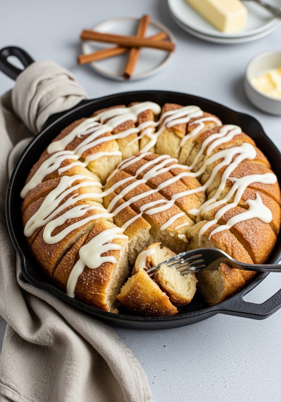 Serve warm straight from the skillet so everyone can pull pieces apart. This pairs beautifully with coffee or a brunch spread. Store leftovers in a cake dome or airtight container at room temp for 2 days or freeze slices wrapped in plastic for up to 1 month.