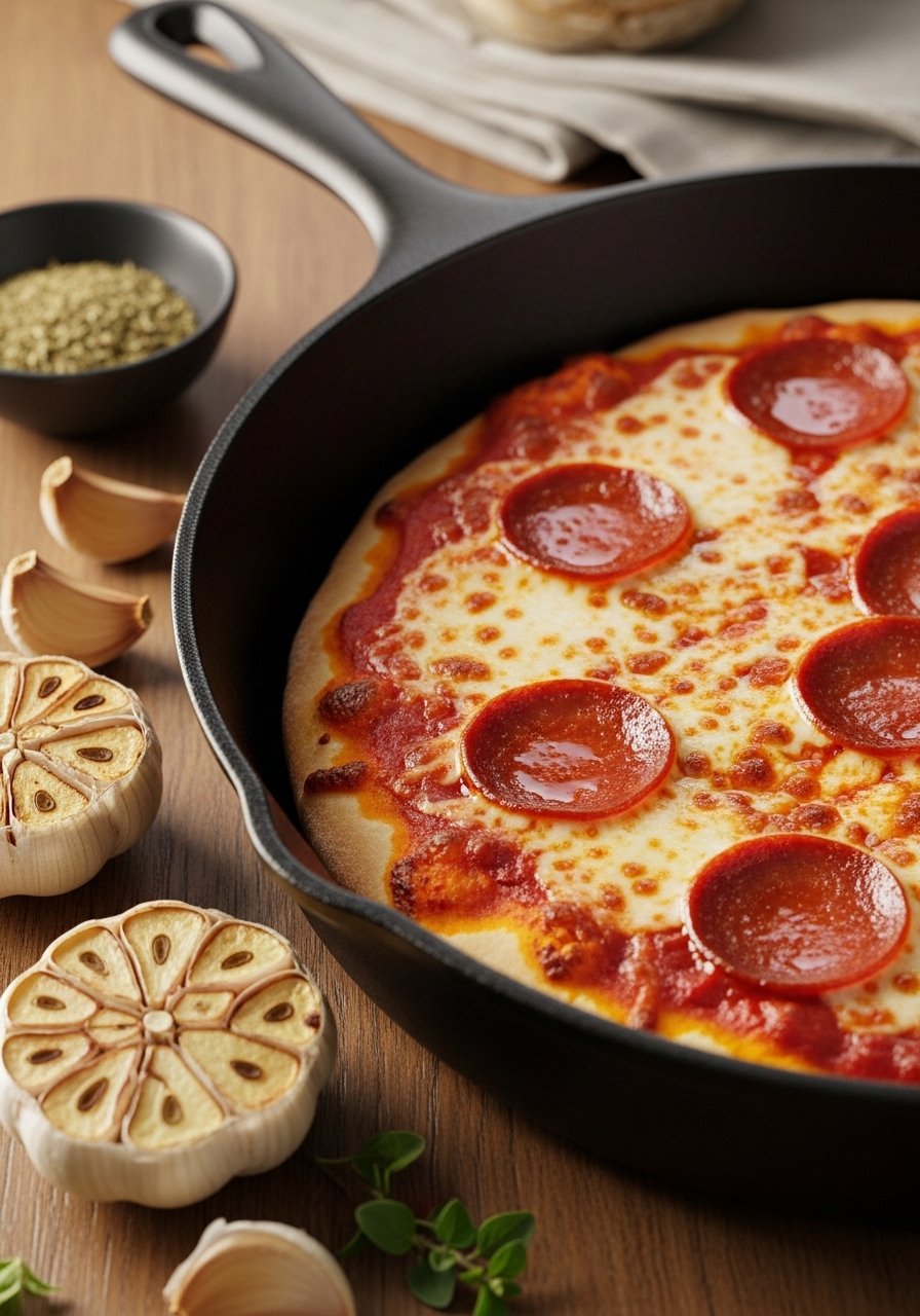 This pepperoni recipe uses a cast-iron skillet for an extra-crispy edge and deep, golden crust—almost like pizza delivery’s best but brighter. The pan creates an even heat and a crackling bottom crust while bubbling cheese reaches caramelized spots. If you want crisp edges with a tender middle, this method is for you.