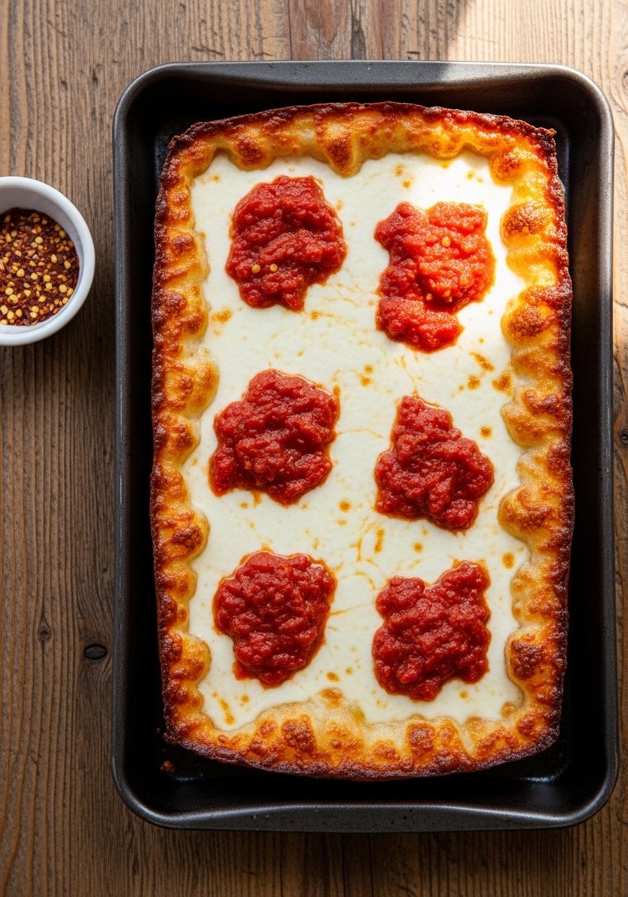 - Remove and spoon the pizza sauce in three stripes along the top (classic Detroit style). Let rest 5 minutes, then slice with a sharp pizza cutter.
