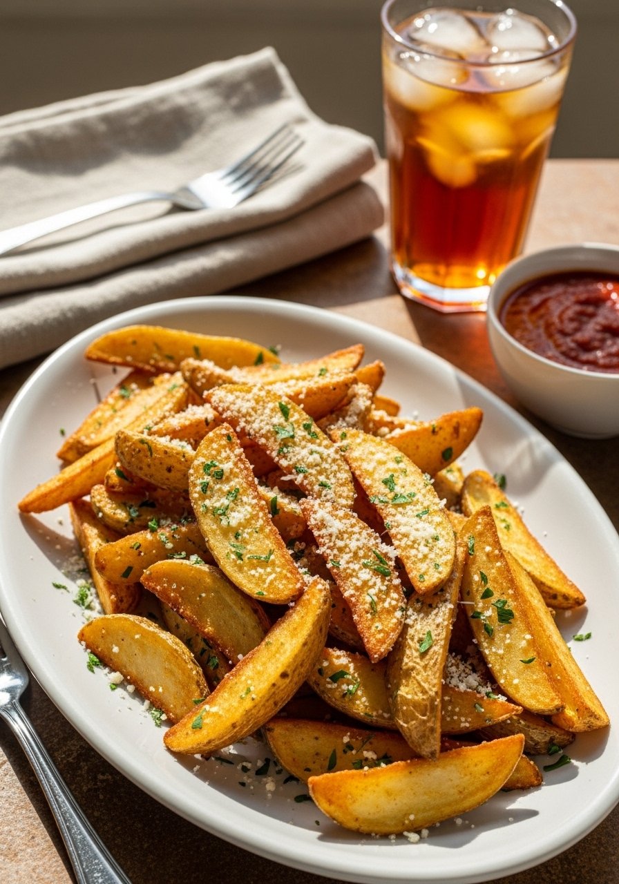 These garlic-Parmesan wedges have crunchy, herb-speckled edges and a soft, steamy center. They’re tossed in olive oil, garlic, and Parmesan, then roasted until golden-brown. They work for weeknight dinners or game-day platters and are great for garlic lovers who want crisp texture with cheesy flavor. The aroma of roasted garlic and crisp crust is irresistible.