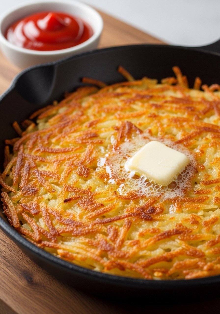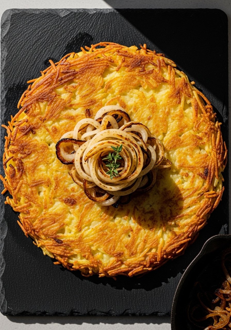 This Swiss-inspired rösti forms a crunchy crust with a tender interior and rich topping. Caramelized onions add sweet depth while a touch of butter delivers a nutty aroma. Serve as a brunch centerpiece or a side for roasted meats.