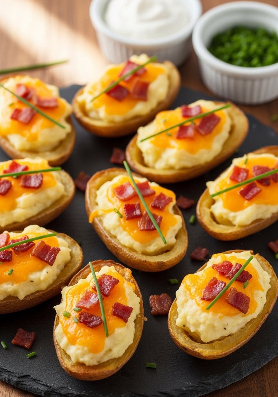 Potato skins get a luxurious second bake to crisp the shells and fluff the filling. Each bite has crunchy edges, creamy center, and melty cheese—like a loaded potato in bite form. These are party-friendly and addictive.