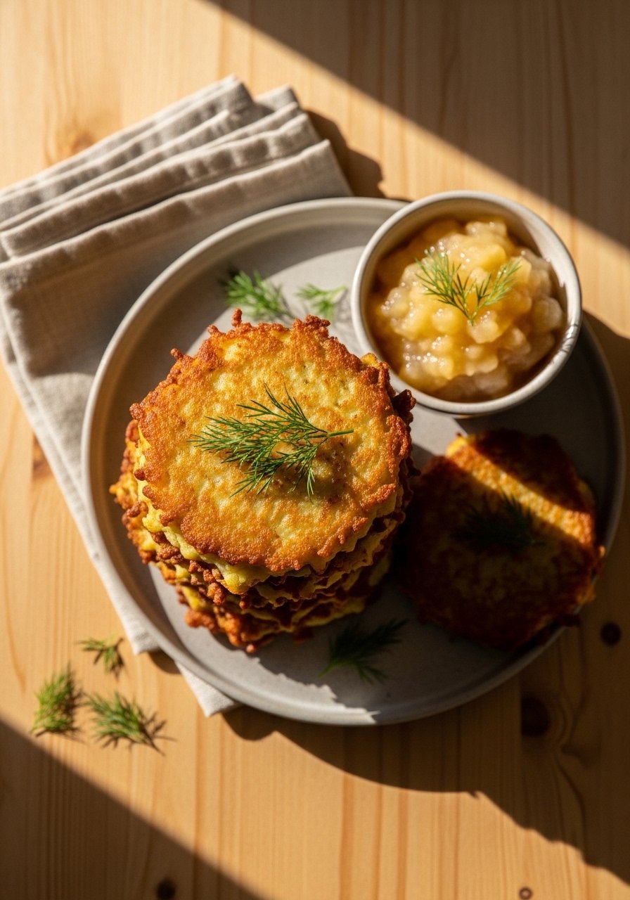 Stack latkes on a platter topped with dill or chives. Offer sour cream and applesauce as classic companions. Keep in airtight food containers for up to 2 days; reheat in a skillet to return crispness. Great for holiday brunch or comfort-food nights.