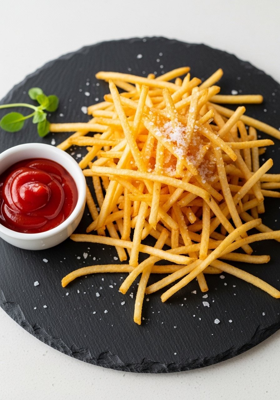Serve hot with ketchup, aioli, or malt vinegar. Pair with burgers, fried chicken, or sandwiches. Store cooled fries in airtight food containers for one day; re-crisp in a 425°F oven for 5–8 minutes. For extra crunch, finish under the broiler for 1–2 minutes while watching closely.