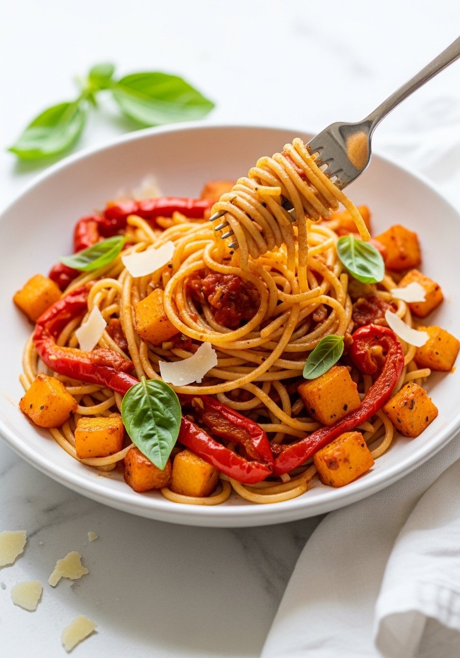 Bright, cozy, and flexible—this pasta uses whatever vegetables are in your fridge and turns them into a roast-sweet, tomato-forward sauce. It’s filling but fresh, with caramelized edges and herb brightness. People who want comfort without heavy cream will love the balance of sweet squash, tangy tomatoes, and a hit of basil.