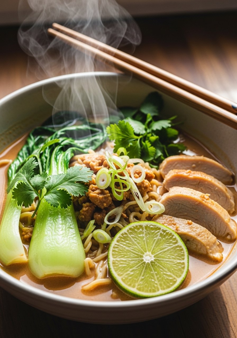 This is one-pot comfort with a Thai twist—creamy peanut-forward broth, tender shredded chicken, and springy noodles. It hits savory, tangy, and spicy notes fast, making it a top quick lunch recipe for colder days or whenever you want a cozy mid-day bowl.