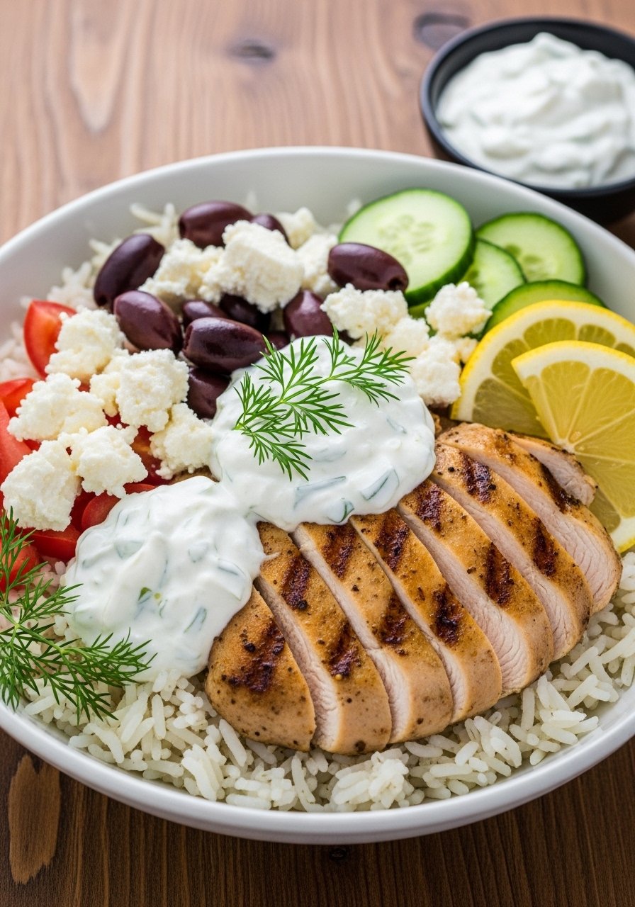 4. Assemble bowls: rice base, sliced chicken, cucumber, feta, olives, and a generous spoonful of tzatziki.