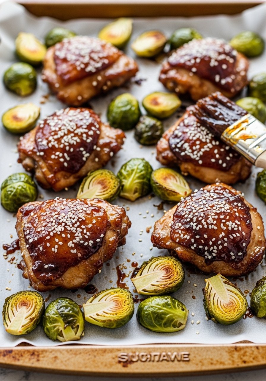 4. Place chicken thighs on the pan, brush with half the glaze. Roast 20–25 minutes until chicken reaches 165°F and sprouts are golden; baste chicken with remaining glaze at 15 minutes for a sticky finish.