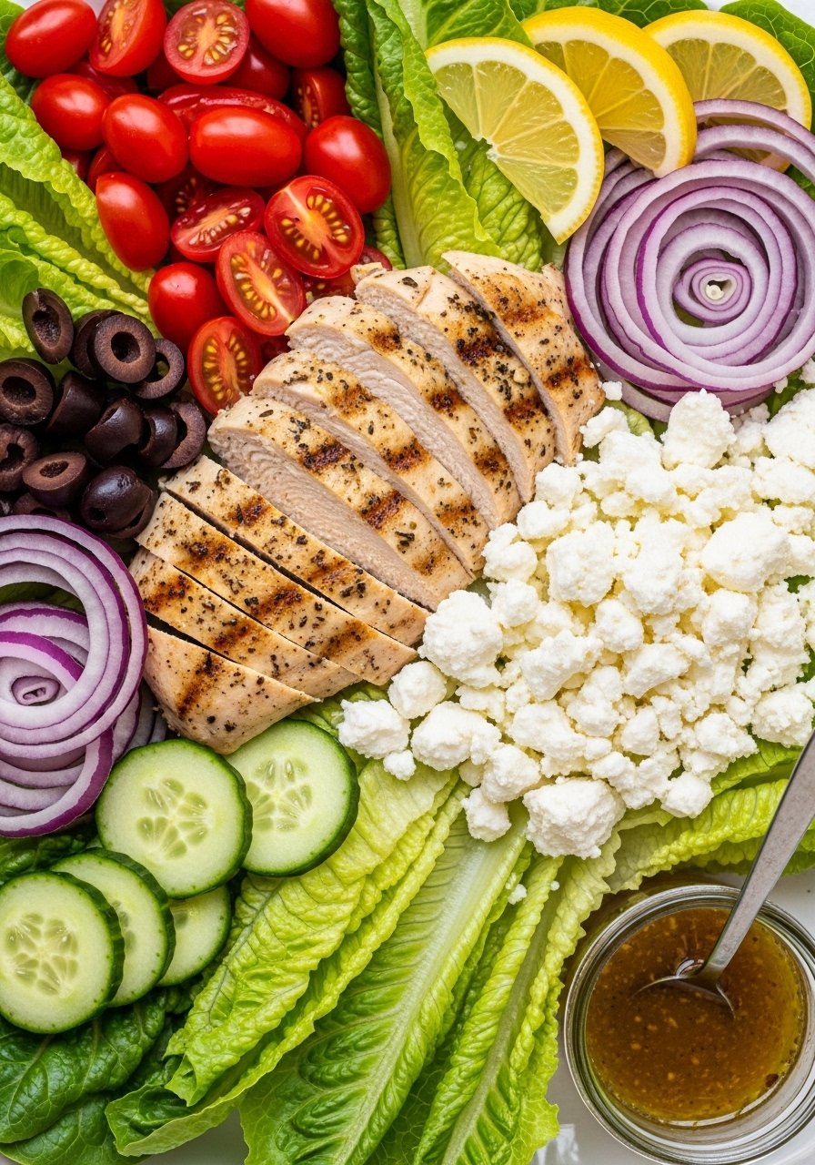 Crisp vegetables, grilled juicy chicken, and a tangy lemon-oregano dressing make this a reliable, fast lunch. It’s packable, satisfying, and hits high-protein lunch goals without heavy dressings.
