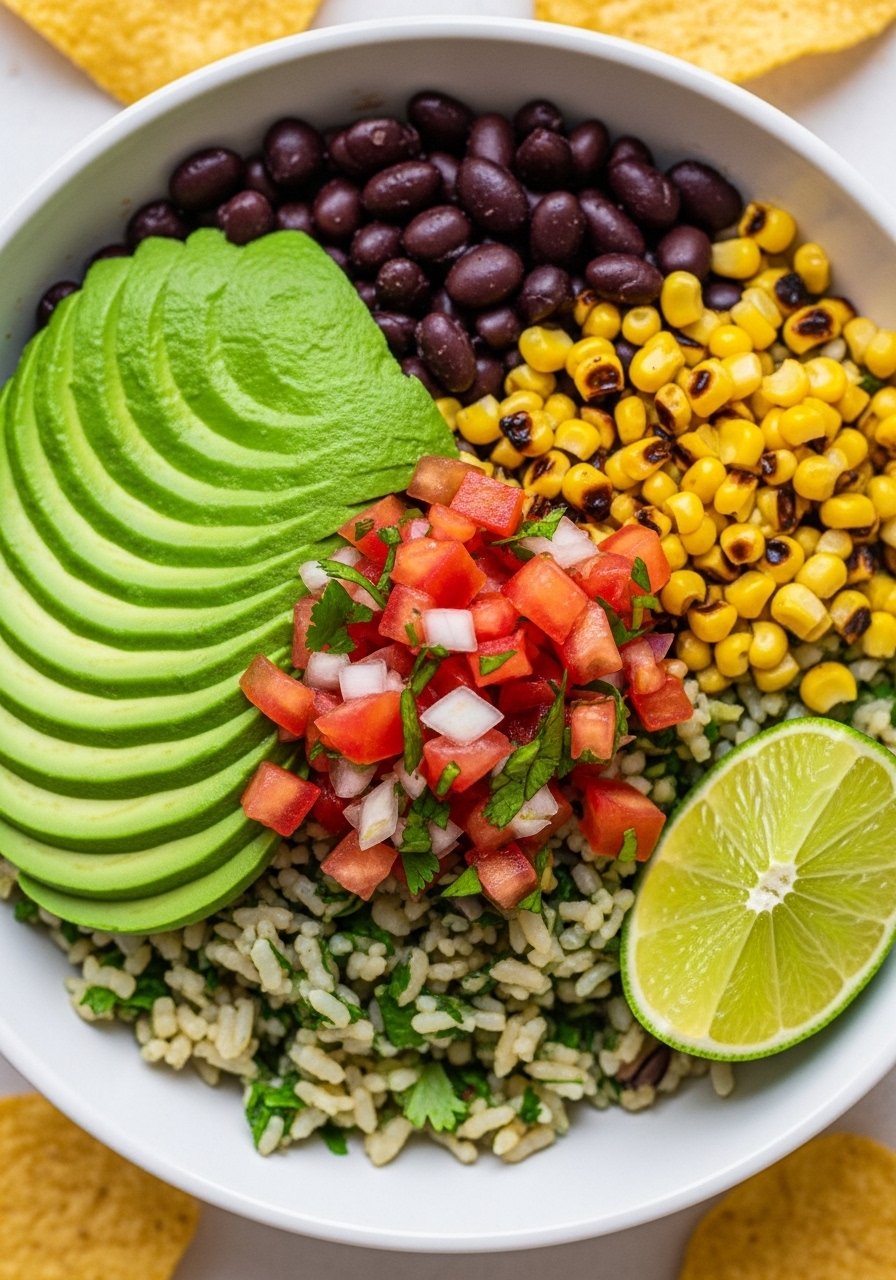 - Assemble bowls with rice base, black beans, roasted corn, pico de gallo, and sliced avocado.