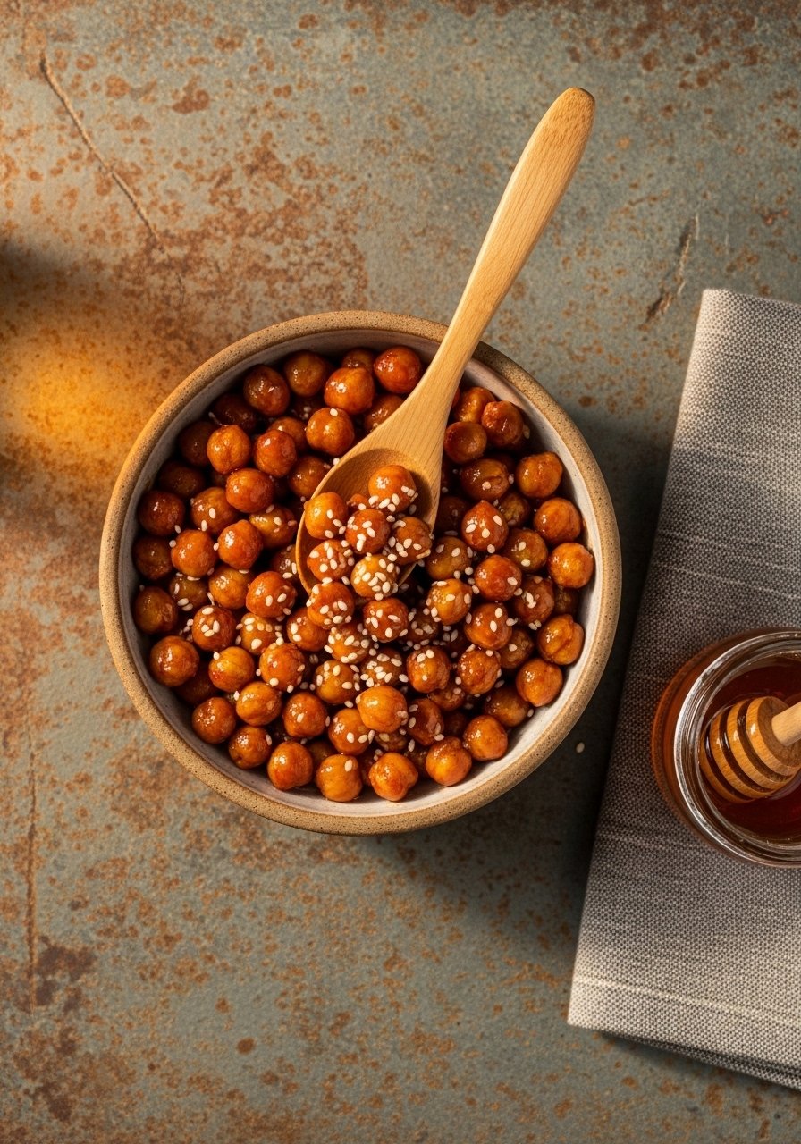 7. Return coated chickpeas to the baking sheet and roast 5–7 minutes more, watching closely so they don’t burn. They’ll finish glossy and slightly sticky.