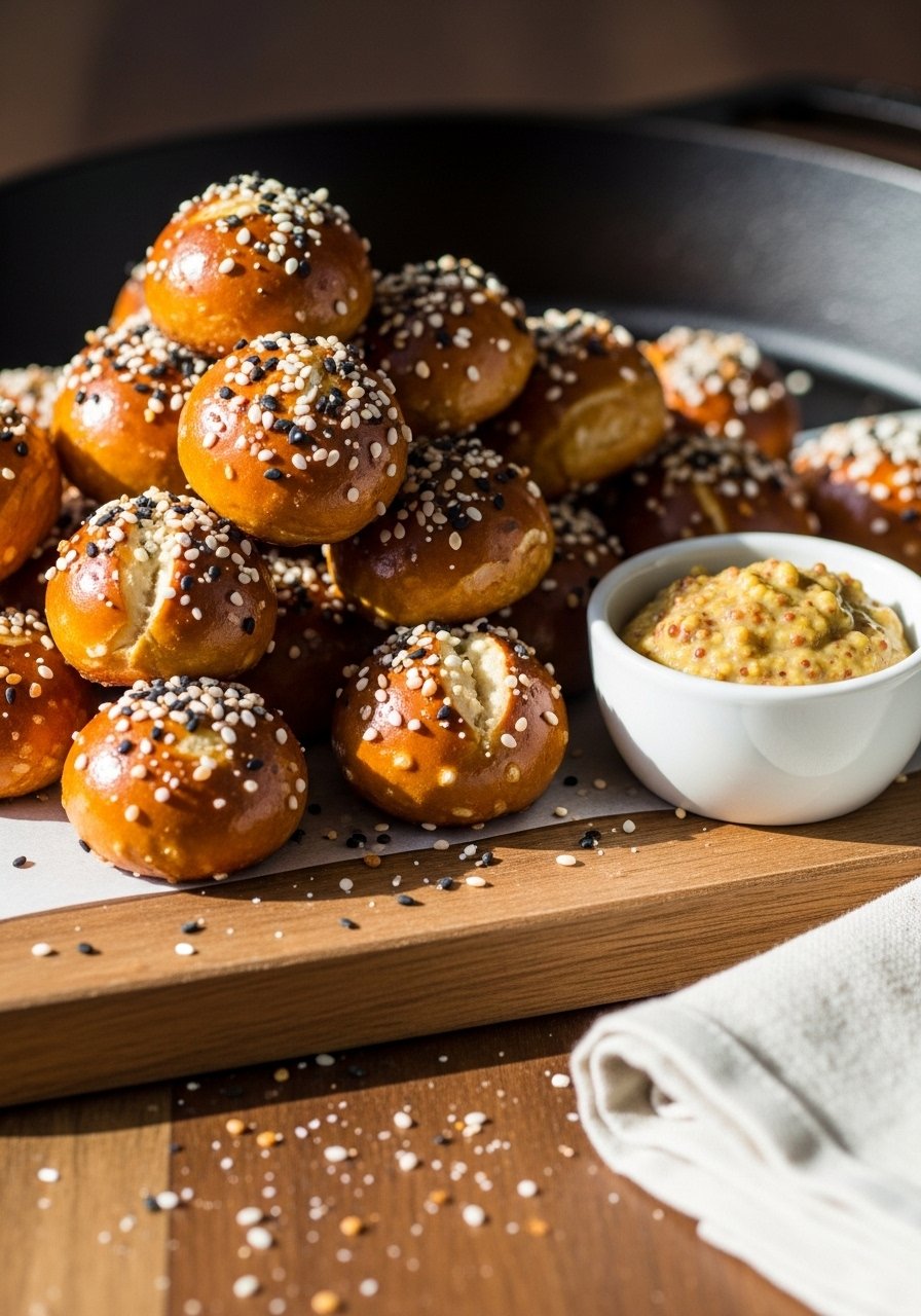 Serve warm on a wooden board with small bowls of mustard or cheese dip. Store cooled bites in an airtight container at room temperature for 2 days; reheat briefly at 350°F to refresh.
