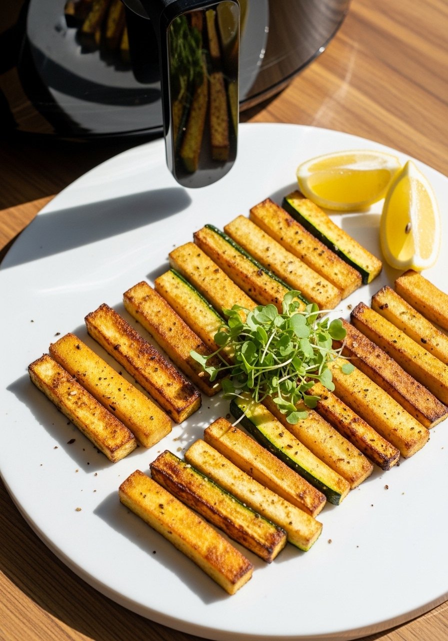 5. Spray tops of coated zucchini lightly with cooking spray. Air fry 10–12 minutes, flipping halfway, until golden and crisp.