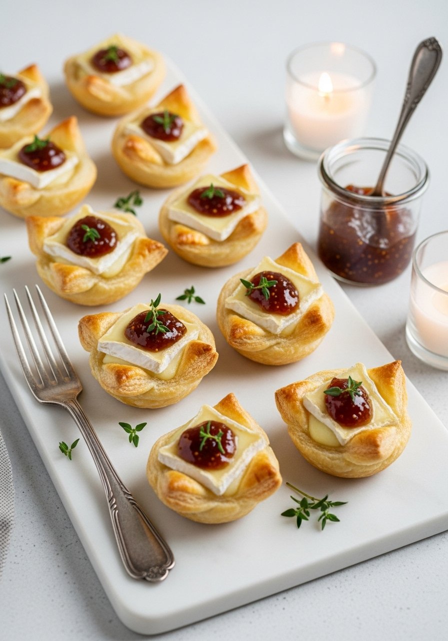 Arrange brie bites on a white cake stand or platter with fresh grapes and crackers. Make-ahead: assemble and refrigerate up to 6 hours, then bake just before guests arrive. Store leftovers in the fridge in an airtight container for 1–2 days; reheat briefly at 350°F for 5–7 minutes.