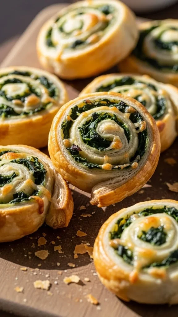 Pinwheels look like you tried hard, but puff pastry does the work. Thaw puff pastry, spread on a layer of cream cheese (or thick yogurt), add spinach and shredded cheese, then roll and slice. Bake until puffed and golden.