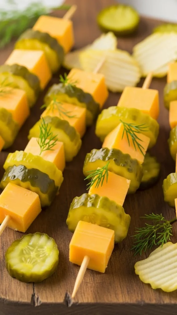These are the easiest no-cook bites on the list. Cube cheddar, slice pickles into thick rounds, and add cherry tomatoes or cucumber chunks if you have them. Thread onto toothpicks and pile onto a platter.