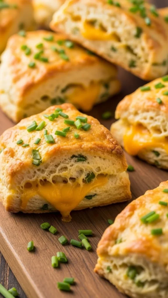 Savory scones bring cozy bakery vibes to your party table. Mix flour, baking powder, salt, butter, shredded cheddar, and chopped chives. Stir in milk until a dough forms, then pat into a round and cut into wedges. Bake until golden.