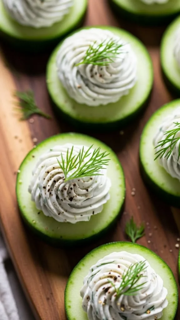 These are great for guests who want something light. They also balance out warm, cheesy snacks. Make them right before serving so the cucumber stays crisp.