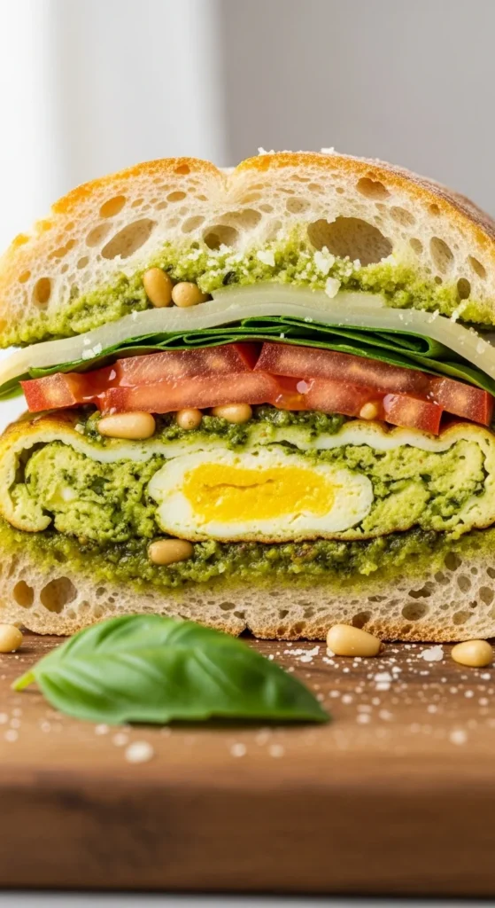 Spread pesto on toasted English muffins or rolls. Add a scrambled egg or fried egg and a slice of cheese. Wrap in foil for an easy grab-and-go breakfast.