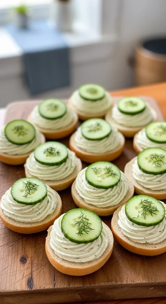 Slice mini bagels, spread with cream cheese, and top with cucumber rounds and chopped green onions. Add black pepper.