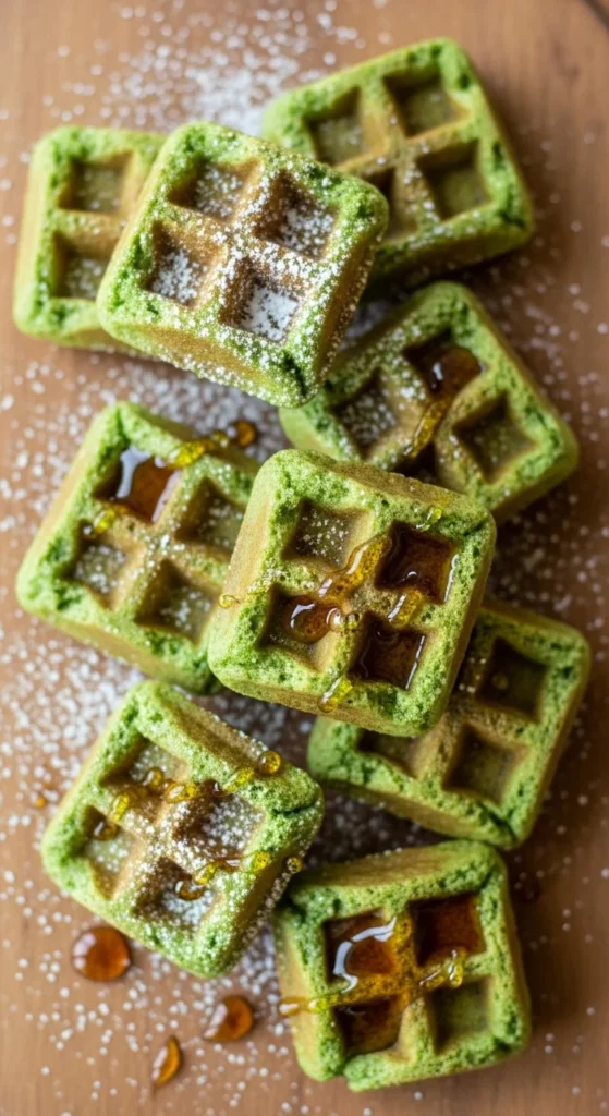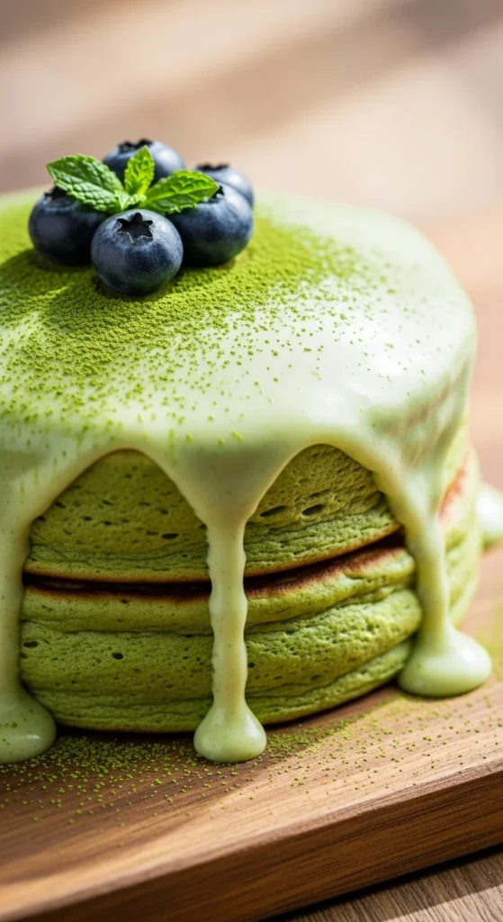 Add a small spoon of matcha powder to pancake batter for a soft green color. Cook mini pancakes so they stack easily and serve with jam, honey, or yogurt. Finish with green fruit on the side.