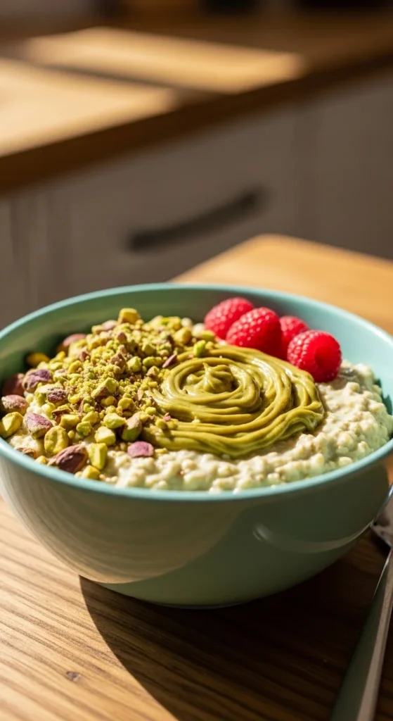 Cook oats with milk or water and a pinch of salt until creamy. Top with chopped pistachios, kiwi, and a drizzle of honey. Add a spoon of yogurt for extra creaminess.