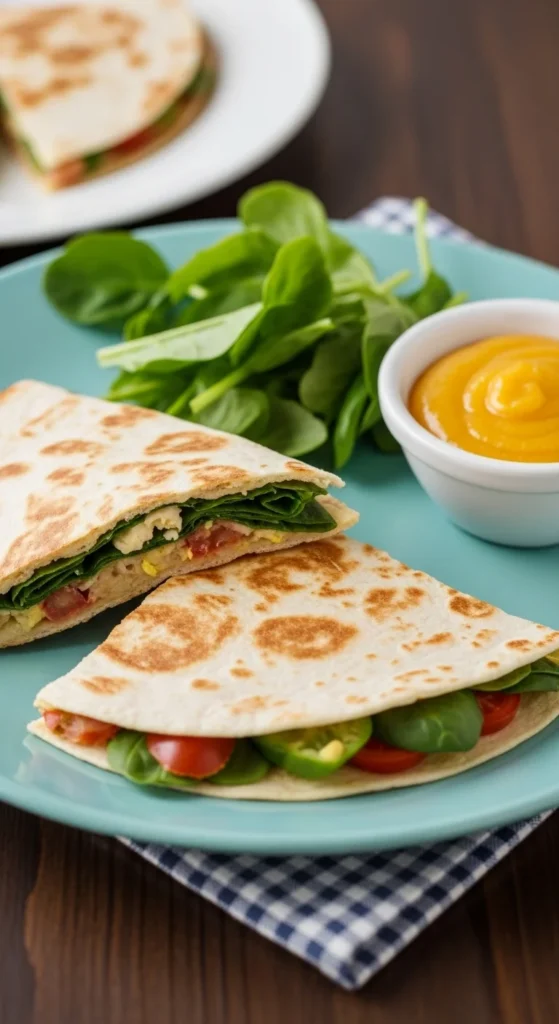 Sauté spinach with green onions. Add to tortillas with scrambled eggs and cheese, then toast until crisp and slice into wedges.