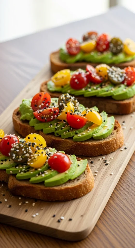 A toast board looks fancy but is simple. It’s also flexible—people choose their own toppings and you avoid making individual plates.