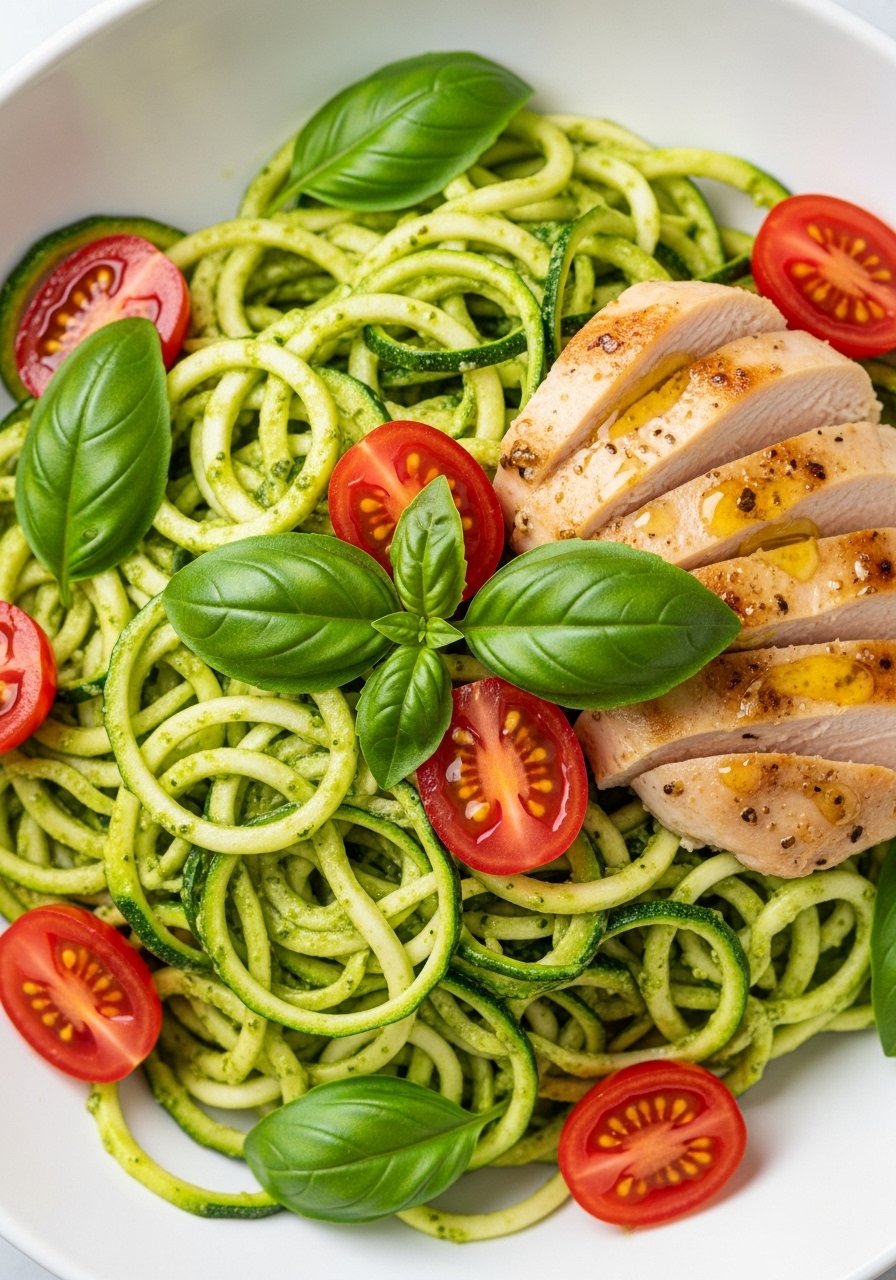 This zucchini noodle pesto pairs bright basil pesto with tender grilled chicken for a filling, low-carb dinner—an excellent pick in a roundup of Weight Loss Recipes. The zucchini "noodles" stay al dente, and the pesto provides depth without heavy cream. Lovely for spring and summer dining.